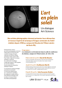 Des artistes photographes viennent présenter leurs démarches et travaux inspirés de la banque d’images centenaire du Soleil réalisée depuis 1908 au campus de Meudon de l’Observatoire de Paris-PSL. Les adhérents retraités du CESOP sont invités à assister aux 3 conférences qui se dérouleront dans la salle de conférence du château de Meudon entre 12H et 13H. Cet évènement est organisé par le LIRA.