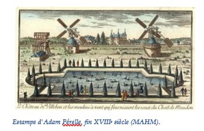 Il s’agit d’un dessin allégorique, puisque le bassin du Bel-Air au premier plan, situé dans l’observatoire, est en réalité éloigné des deux moulins à vent (qui étaient situés sous l’actuelle route N 118 au niveau des deux cèdres) et de l’ancien château de Villebon dessiné en arrière-plan.