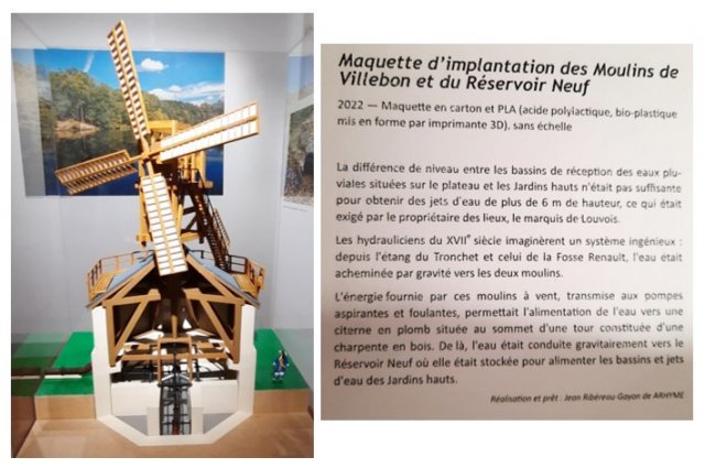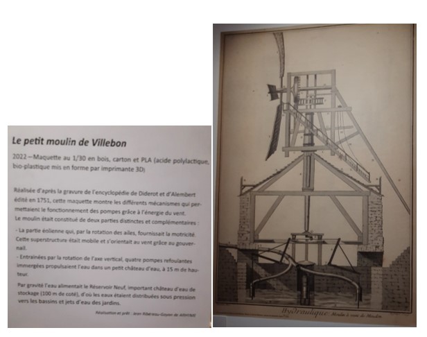 La création pour la première fois de jets d’eau de grande hauteur a été permise par l’invention de nouvelles techniques permettant de réaliser un réseau d’eau sous pression importante. Ci-dessous le château d’eau et les deux moulins de Villebon actionnant les pompes à piston alimentant le château d’eau.
