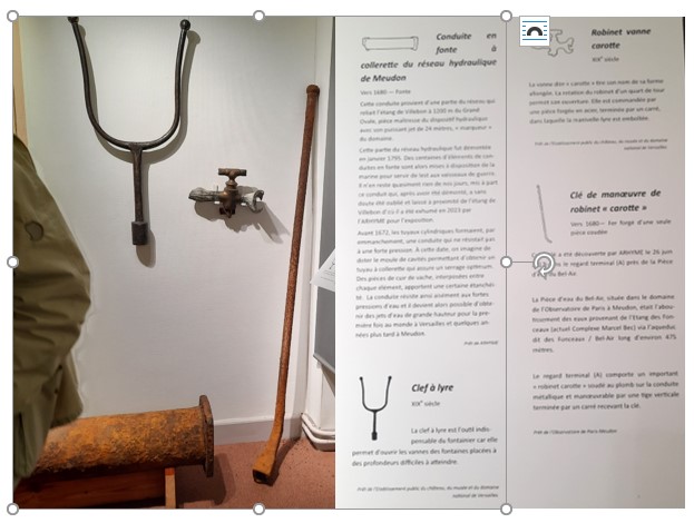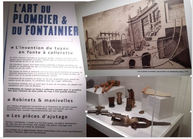 Jean, Pierre, Claude et d’autres membres d’ARHYME, nous ont fait un point historique sur l’exposition avant l’accès aux salles. Le réseau hydraulique du domaine de Meudon est composé d’aqueducs, de rigoles, de réservoirs et de moulins. Ce système construit entre 1680 et 1682 permettait d’alimenter les somptueux jets d’eau et fontaines des jardins à la française des châteaux.
